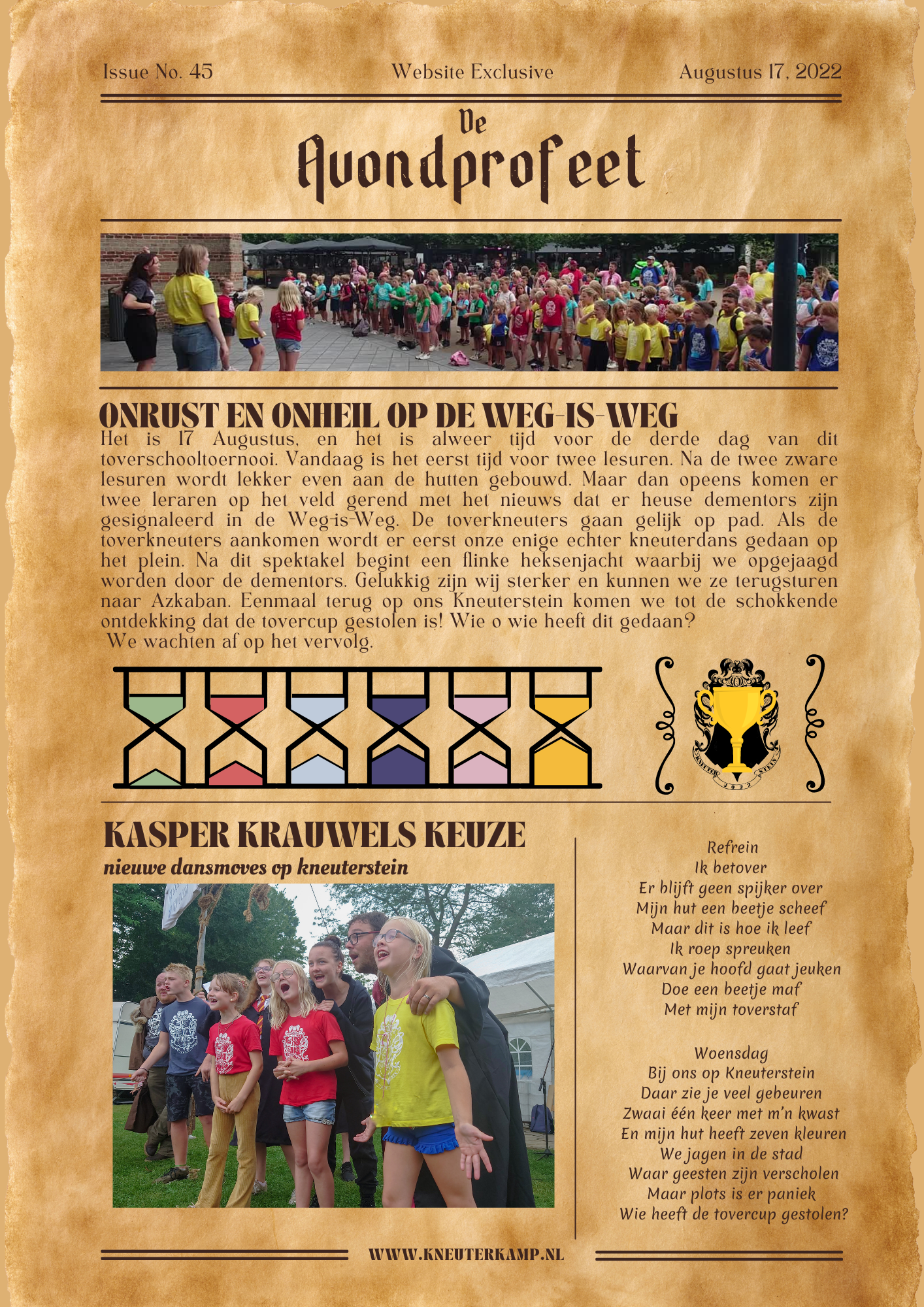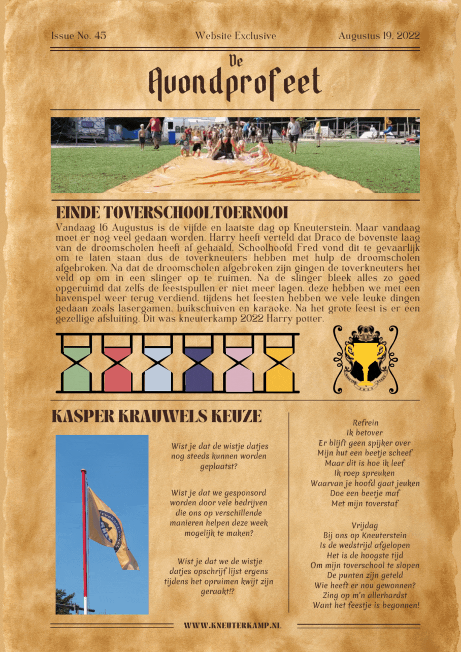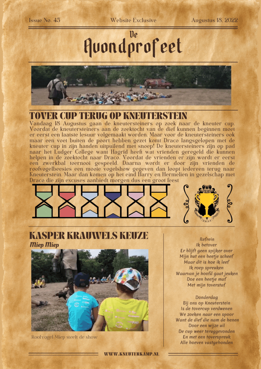 Kneuterkamp 2022 is een feit! De Kneuters hebben een week lang gestreden om de Grote Kneutercup met - wie had dat gedacht? - een zesvoudig gelijkspel als resultaat. We hebben toverscholen gebouwd, zwerkbal geoefend en een heus zwerkbaltoernooi gehouden, op Dementors gejaagd, de Kneutercup verloren en deze met dank aan een wijze uil weer teruggevonden.